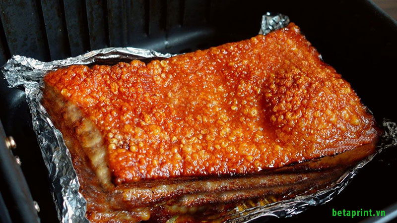 Thịt heo giòn bì nướng bằng nồi chiên không dầu – lớp da nổ giòn rụp, vàng đều, thịt bên trong mềm mọng và thơm hấp dẫn.